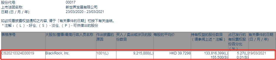 智通财经APP获悉,香港联交所最新资料显示,3月19日,贝莱德增持新世界发展(00017)921.5万股,每股作价39.7298港元,总金额约为3.66亿港元。增持后最新持股数目约为1.34亿股,最新持股比例为5.27%。
