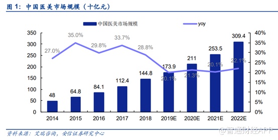 根据艾瑞咨询数据,近五年,中国医美市场快速增长,年增速保持30%上下,2018年市场规模达1448亿元,5年CAGR达31.79%。