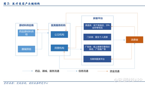 医疗美容行业的产业链主要包括三个核心环节:1)上游原料及药械供应商,主要从事玻尿酸、肉毒素、胶原蛋白等原料以及激光美容器械的研发、生产。2)中游服务机构,主要包括公立医院整形美容科、民营医疗美容医院以及众多小型诊疗机构。3)下游获客平台,主要包括线下美容院、SPA会馆、医院等导流机构、线上搜索类平台以及线上垂直类医美、大健康平台。