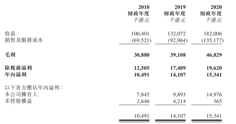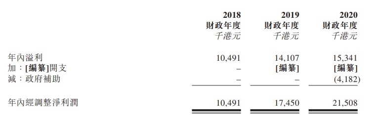 2018-2020财政年度,该公司收益分别约为1.00亿港元、1.32亿港元及1.82亿港元,经调整年内溢利(不包括非经常性开支及一次性政府补助)分别约为1049.1万港元、1745万港元及2150.8万港元。