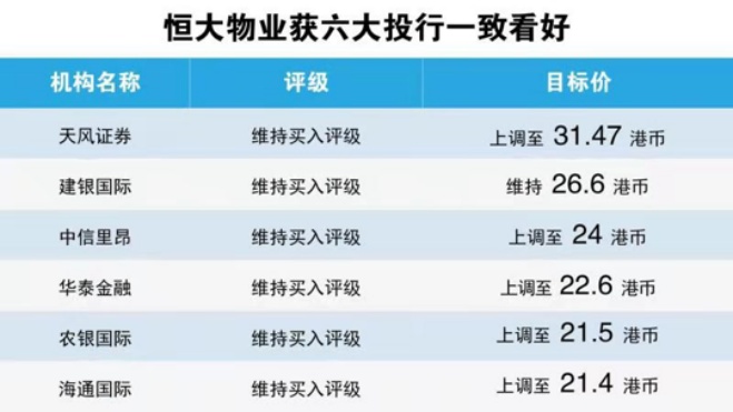 恒大物业(06666)的亮眼年报备受资本市场看好。日前,天风证券、建银国际、海通国际等多家投行发布研报,纷纷给予“买入”评级,目标价31.47港元,潜在涨幅达114%。