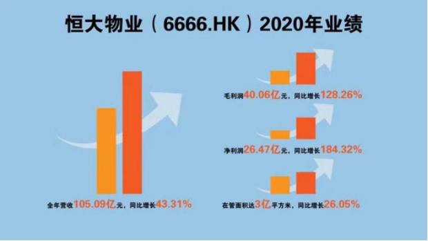 年报显示,2020年恒大物业实现营收105.1亿,同比增43.3%;净利润26.5亿,同比增184.3%;在管面积达3亿平方米,同比增26.1%。管理层表示,预计年末在管面积将突破6亿平方米,同时公司也将坚持科技赋能,联手腾讯、阿里、房车宝等科技巨头,深耕增值服务。