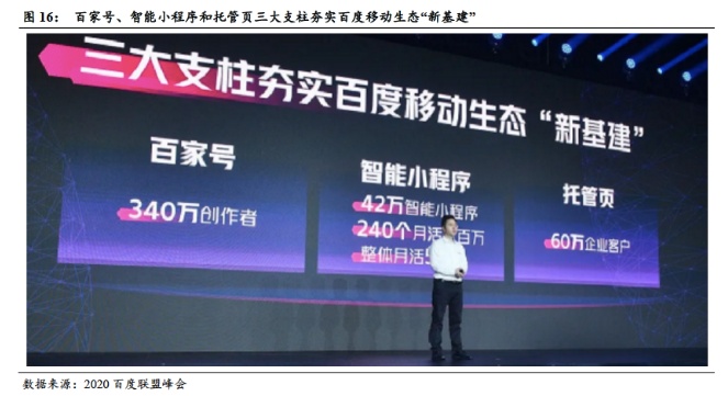 2019年5月,百度宣布搜索公司战略转型为移动生态事业群组,随后百度就搭建起了以百度APP为核心,以百家号、智能小程序和托管页为三大支柱的移动生态布局。在这三大支柱中,百家号是百度为创作者打造的集创作、发布、变现于一体的内容创作平台,也是众多企业号实现营销转化的运营新阵地;小程序是商家的运营主阵地,将搜索连接信息、知识、服务;托管页则是面向商家的移动商业解决方案——从快速建站、运用营销工具到以技术和数据做客户管理,形成一整套闭环营销体系。