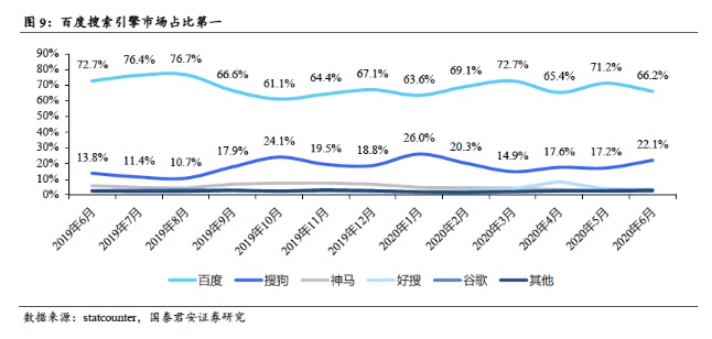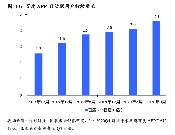 百度是全球最大的中文搜索引擎,百度 APP是其衍生出来的具有“搜索+资讯”功能的手机客户端。2020年6月,百度搜索引擎市场占比66.15%,排名第一,市场龙头地位稳固。百度 APP依托百度网页、百度图片、百度新闻、百度知道、百度百科、百度地图、百度音乐、百度视频等专业垂直搜索频道,帮助手机用户更快找到所需,打造快捷手机新搜索,日活用户持续增长,2020年9月日活达到2.3亿。