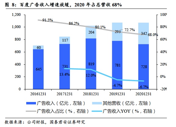 百度营收主要来源于广告收入,近年广告收入增速放缓。依托丰富的移动生态产品,广告是百度的核心收入来源。近年来百度广告收入占总营收比例逐年下降,对广告业务的依赖性降低,广告业务占总营收比例在16/17/18/19/20年分别为91%/86%/80%/73%/68%。同时,广告业务的增速放缓,在17/18/19/20年分别为13%/12%/-5%/-7%。
