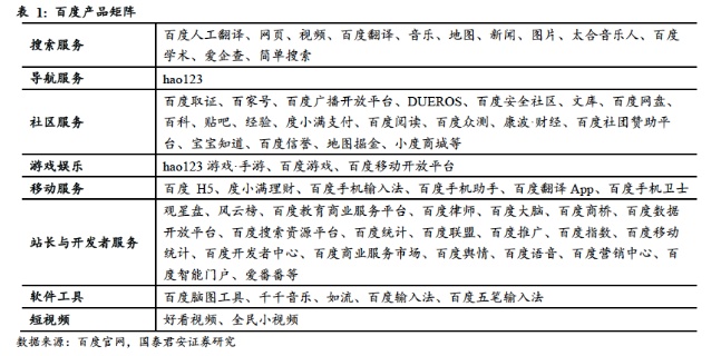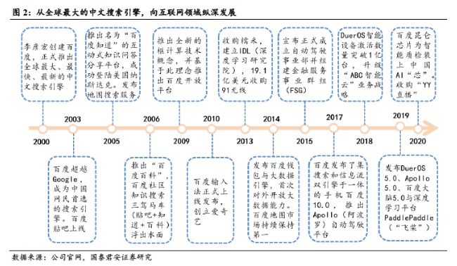 从全球最大的中文搜索引擎,向移动生态、AI和自动驾驶等互联网领域纵深发展。百度成立开始定位为“全球最大、最快、最新的中文搜索引擎”,在2003年百度超越google,成为中国网民首选的搜索引擎,并于2006年完成了百度社区知识搜索三驾马车(百度贴吧+百度知道+百度百科)的布局。在发展过程中,百度通过创立爱奇艺(IQ.US),收购千千静听、糯米和YY直播等公司,不断丰富自己的移动生态。2015年,百度宣布正式成立自动驾驶事业部并组建金融服务事业群组(FSG)。2017年,百度推出Apollo(阿波罗)自动驾驶平台。2019年,百度发布DuerOS 5.0、Apollo 5.0、百度大脑5.0与深度学习平台 PaddlePaddle (“飞桨”)。