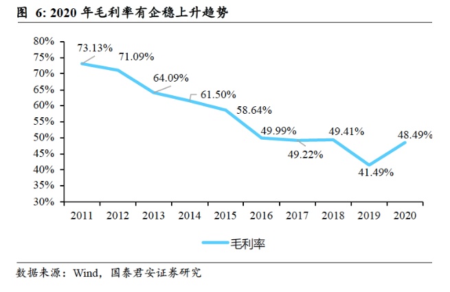 2020年毛利率有企稳上升趋势,研发费用率总体呈现上行趋势。2011-2020年,百度公司毛利率总体呈现下滑趋势,从2011年的最高值73.13%下降至2019年的最低值41.49%,2020年毛利率回升至48.49%,有企稳上升的态势。近10年,百度研发开支不断上行,研发费用率总体呈现上升态势,2020年研发开支为195.13亿元,研发费用率达到18.22%。