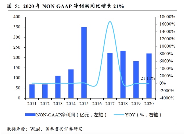 营收增速逐渐放缓,净利润回归正常水位。2011-2020年百度营业收入总体呈现上升趋势,营收同比增速波动下降,2020年营收为1070.74亿元,同比增速为-0.32%,首次为负。2011-2015年,百度NON-GAAP净利润总体呈现上升趋势,2015年增速达到147.72%,2016年NON-GAAP净利润下滑至1.3亿元,2017年迅速回升至222.7亿元,2017-2020年,NON-GAAP净利润总体呈现波动趋势,2020年NON-GAAP净利润同比增长21%至220.2亿元。