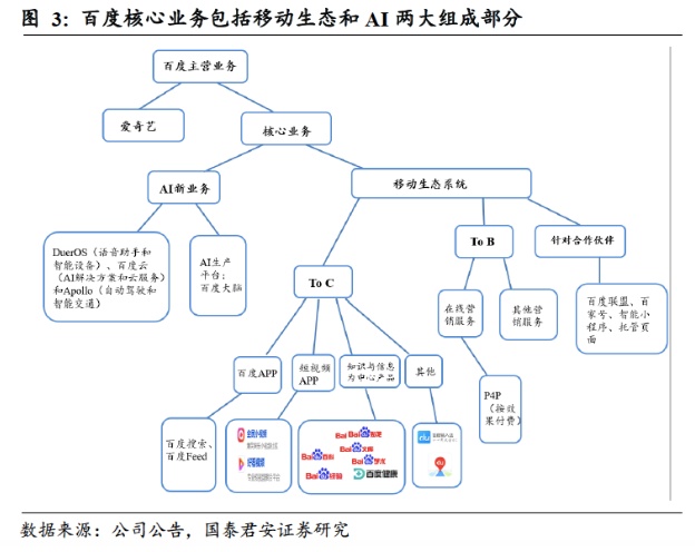 百度核心业务包括移动生态和AI两大组成部分。移动生态系统又分为to C、to B和针对合作伙伴3个部分,to C业务主要包括百度APP、短视频APP、知识信息为中心的产品和其他。AI新业务包括AI生产平台百度大脑、DuerOS(语音助手和智能设备)、百度云(AI解决方案和云服务)和Apollo(自动驾驶和智能交通)。