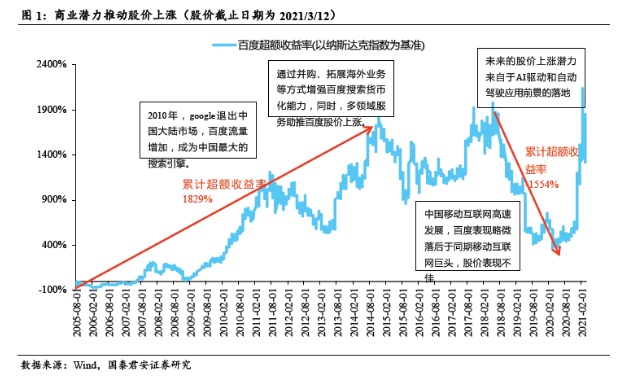 从搜索引擎起家,布局多领域业态,百度成长空间逐渐打开。多领域服务助推百度股价上涨,伴随中国移动互联网高速发展,百度表现略微落后于同期移动互联网巨头,未来的成长潜力来自于AI驱动和自动驾驶应用前景的落地。百度是全球最大的中文搜索引擎,是中国最大的以信息和知识为核心的互联网综合服务公司,更是全球领先的人工智能平台型公司。2000年1月1日创立于中关村,公司创始人李彦宏拥有“超链分析”技术专利,也使中国成为美国、俄罗斯、和韩国之外,全球仅有的4个拥有搜索引擎核心技术的国家之一。伴随自动驾驶和AI的落地,未来百度将拥有更加广阔的发展空间。
