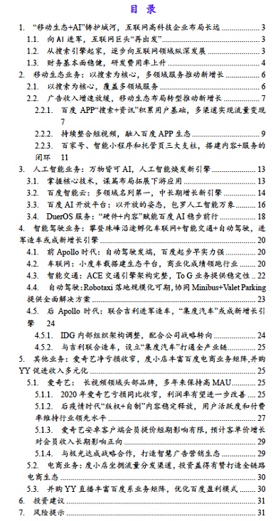 风险提示:政策监管风险、爱奇艺亏损扩大、AI和自动驾驶商业化推广未达预期、广告竞争加剧等。