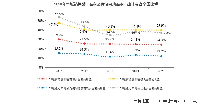 22城商品房销售金额、住宅用地出让金占全国比重近四成。2020年22城商品房销售额占全国商品房销售额的比重为39.9%,22城住宅用地出让金占全国住宅用地出让金的比重为37%,占比均近四成。22城均为核心一二线城市,是我国经济最发达、产业结构与人口规模最具吸引力的地区,住房需求旺盛。2020年22城商品房销售面积占全国的比重为24.3%,住宅用地成交规划建筑面积占全国的比重12.2%。