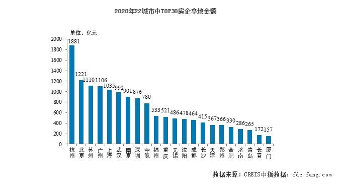 22城中杭州、北京、苏州、广州、上海等城市较受百强TOP30房企青睐。从具体城市拿地金额来看,2020年,百强前三十企业在22城中杭州拿地金额最高,达到1881亿元,占其在22城总拿地金额12.8%;在北京、苏州、广州、上海等城市拿地金额均超1000亿元,拿地规模较大,投资力度相对较强,热点城市热度持续,竞争激烈。