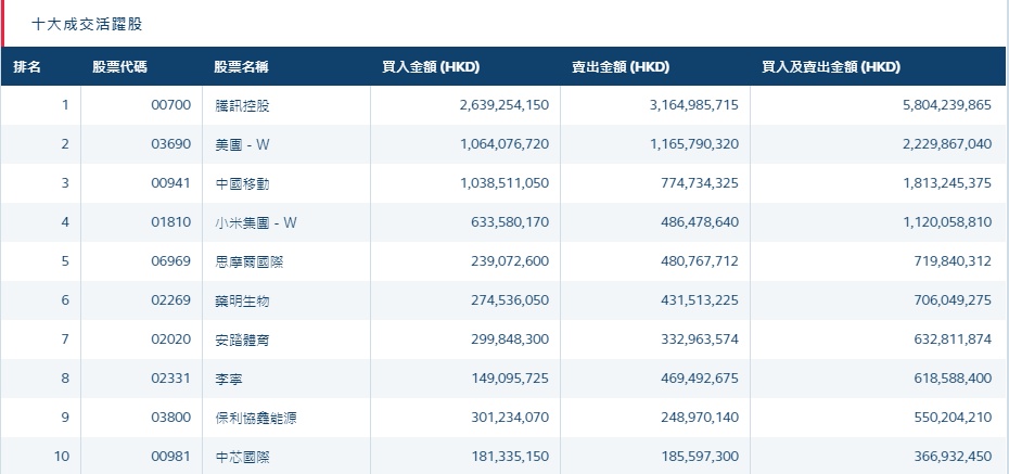 港股通(深)十大活跃成交股
