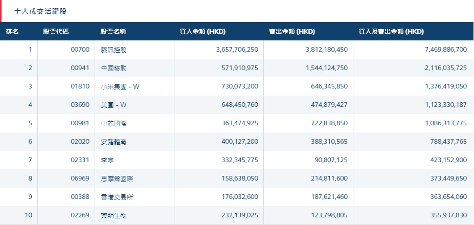 港股通(沪)十大活跃成交股
