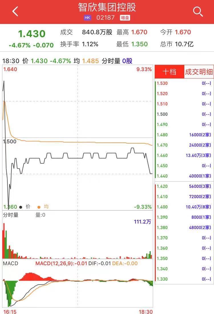 智通财经APP获悉,智欣集团(02187)将于3月26日(星期五)在香港挂牌。截至暗盘收盘,利弗莫尔证券暗盘交易显示报价1.43港元,较招股价1.50港元跌4.67%。每手8000股,不计手续费,每手亏560港元。