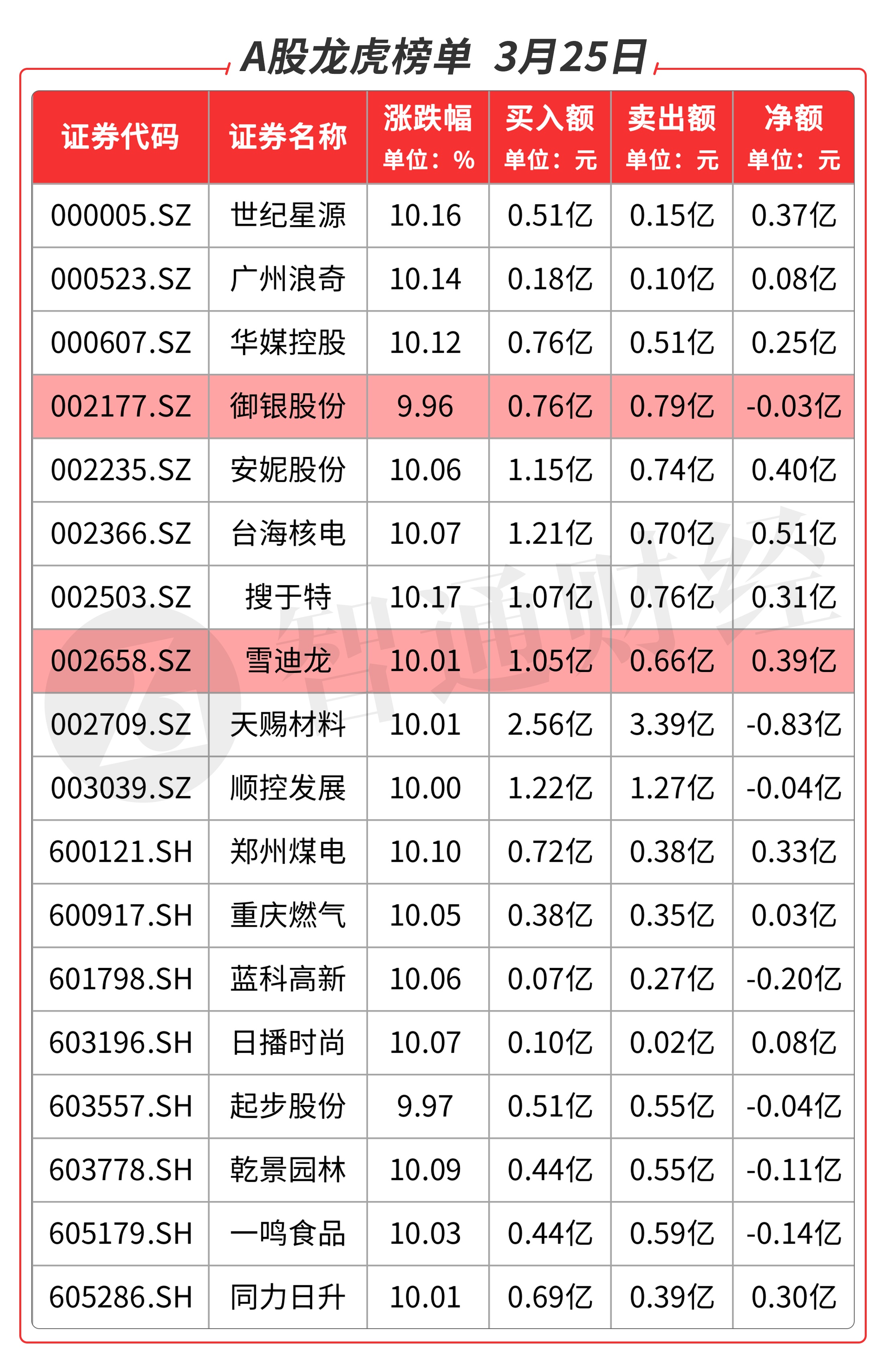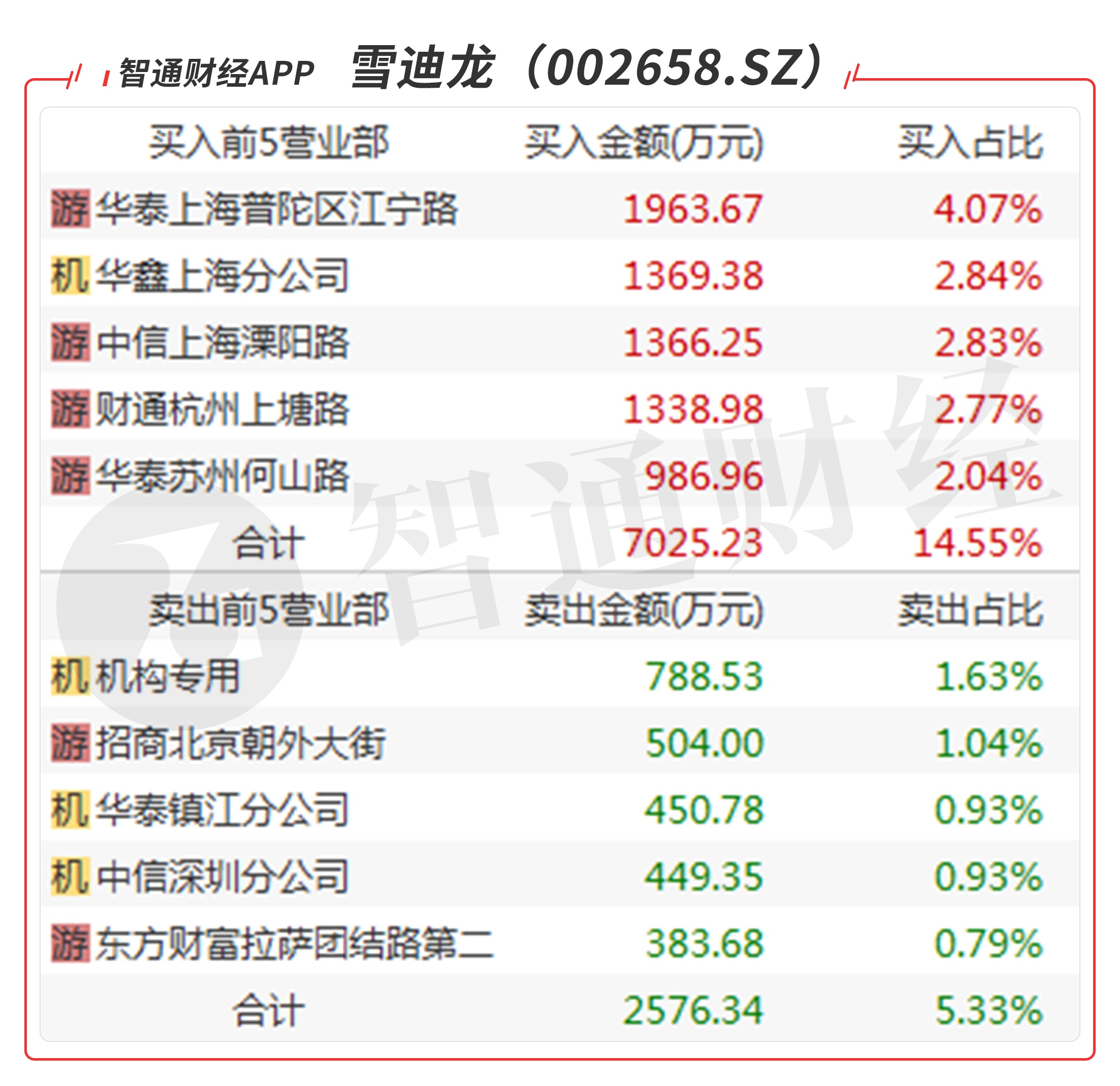 雪迪龙(002658.SZ):多主力现身龙虎榜,前五位席位都是一线游资共买入7603万元,买三是知名游资孙哥的席位买入1366万元,当日净买入4984万元,该股是近期风口品种,主力很凶悍,今天地天板反包,异常强劲,预计有溢价。