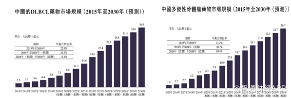 根据弗若斯特沙利文数据显示,中国的多发性骨髓瘤药物2019年市场为57亿元,至2024年将达到147亿元,年复合增长率为20.7%。另外,中国的弥漫性大B细胞淋巴瘤药物市场规模也十分巨大,预计将从2019年的58亿元增长至2024年的186亿元,年复合增长率为26.2%。