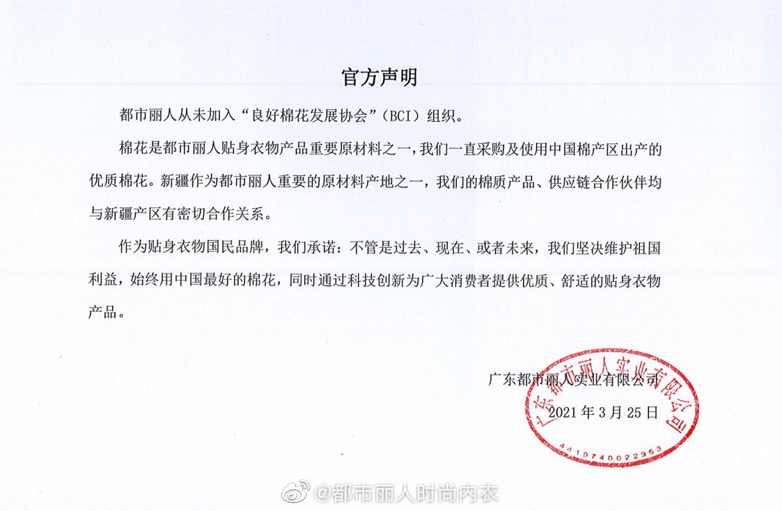 都市丽人承诺:不管是过去、现在、或者未来,坚决维护祖国利益,始终用好中国最好的棉花,同时通过科技创新为广大消费者提供优质、舒适的贴身衣物产品。