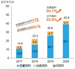 于2020年年底,公司在管面积约为3914.4万平方米,较2019年同期增加约50.1%,规模发展成效卓著。由于公司项目大多来自外拓,合约面积一般迅速转化为在管面积,在当年就带来利润。