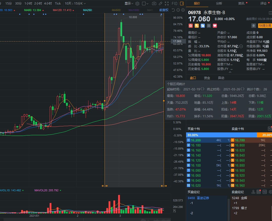 得到二级市场支持,永泰股价也颇为强势,悄然突破了港元18.8元,与历史最低点相比,涨幅足足超过了224%,而最近26个交易日,该股涨幅也超过了47%,甩恒指、生物科技指数一大截。