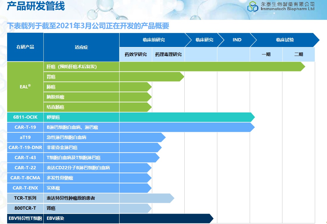 目前,永泰生物有多个TCR-T细胞在研产品正进行临床前研究,并已完成NY-ESO-1TCR-T细胞在研产品的药效研究。公司计划于今年年底前为CAR-T-19-DNR、aT19及NY-ESO-1TCR-T在研产品提交IND申请。
