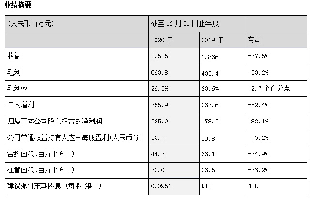 2020年,卓越商企服务经营业绩实现了高速增长,总收入达约人民币25.3亿元,较上年增长37.5%,毛利润为人民币6.64亿元,同比大幅增长53.2%,归属于母公司股东权益的净利润为人民币3.25亿元,同比增加82.1%。建议派付末期股息每股0.0951港元。
