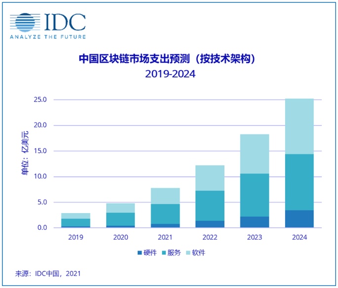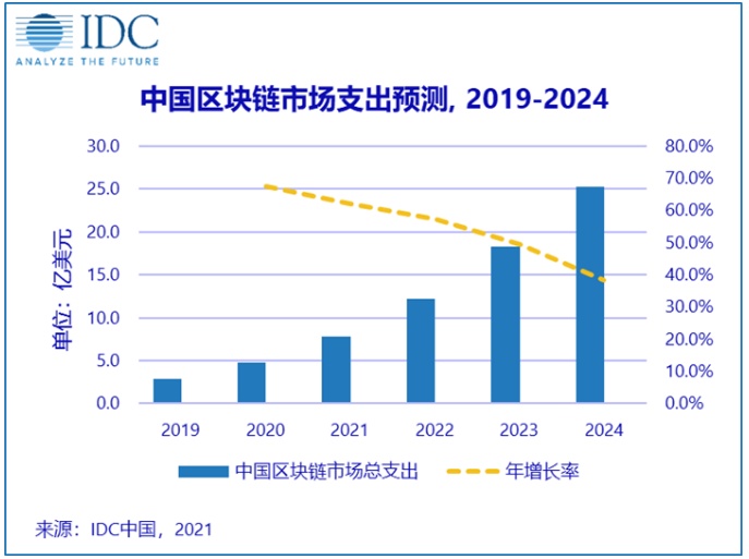 IDC在报告中表示,预计2024年全球区块链市场将达到189.5亿美元,五年预测期内(2020-2024)实现约48.0%的复合增长率。