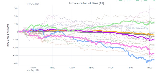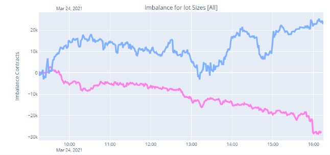 尤其注意的是“E-迷你标普500期货合约” (S&P E-Mini) 的不平衡,McElligott表示,过去两个交易日(3月24日为粉线,3月23日为淡蓝线)是过去一个月以来“卖出”最多的四天中的两天。