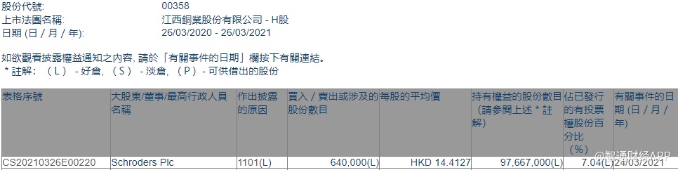 Plc增持江西铜业股份(00358)64万股,每股作价14.4127港元,总金额约为922.41万港元。增持后最新持股数目为9766.7万股,最新持股比例为7.04%。