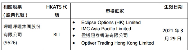 智通财经APP获悉,港交所发布文件称,参照于2021年3月24日发出有关推出哔哩哔哩(09626)股票期货将并于 2021 年 3 月 29 日(星期一)开始买卖的通告,香港期货交易所有限公司宣布委任股票期货市场庄家有Eclipse Options (HK) Limited 等公司。