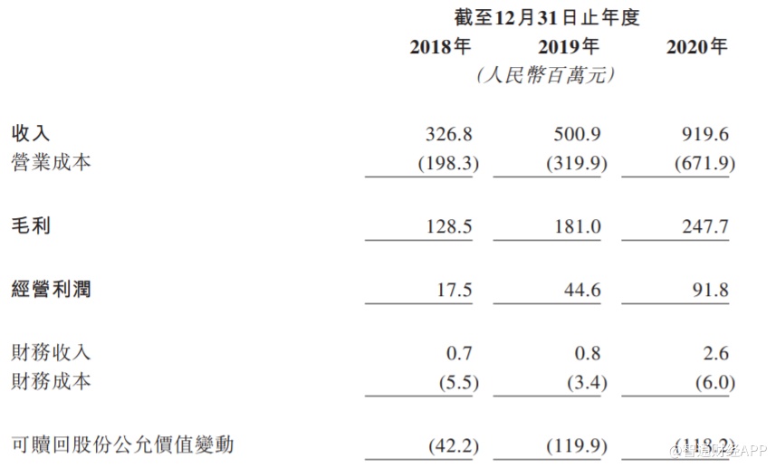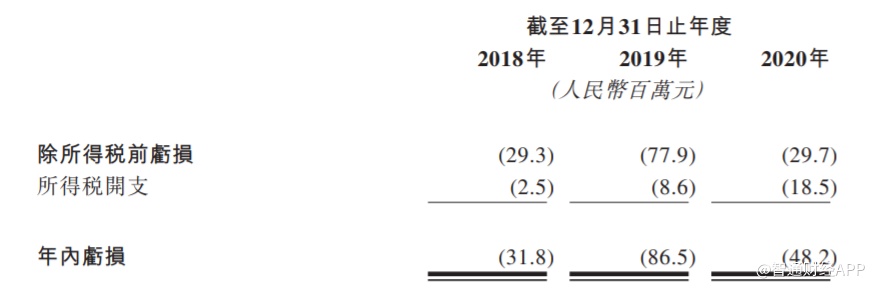 截至2018年、2019年及2020年12月31日止年度,公司收入分别为3.268亿元、5.009亿元、9.196亿元;年内亏损分别为3180万元、8650万元、4820万元。