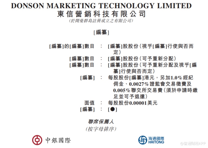 智通财经APP获悉,据港交所3月28日披露,东信营销科技有限公司 (Donson Marketing Technology Limited)向港交所主板递交上市申请,中银国际、海通国际担任联席保荐人。
