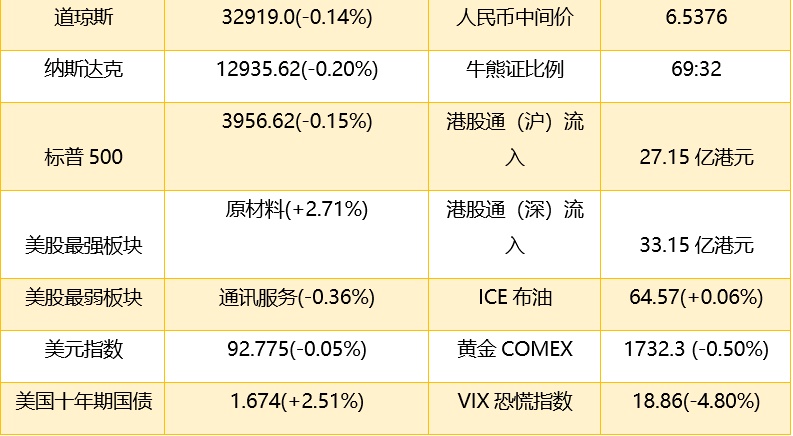 1、 上周五美股收盘,道琼斯指数涨452.58点,涨幅1.39%,报33072.06点;标普500指数涨65.22点,涨幅1.67%,报3974.74点;纳斯达克综合指数涨161.04点,涨幅1.24%,报13138.73点。上周,标普500指数累涨1.57%,道指累涨1.36%,纳指累跌0.58%。