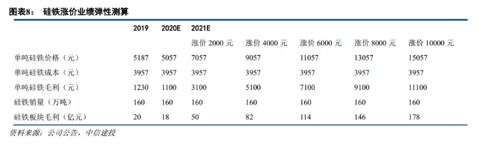 内蒙古十三五的能耗双控效果更差,并且硅铁在钢铁种成本占比更高,因此我们认为相较于山东省控制焦炭产量而言,内蒙控制硅铁产量会更为严格。相关政策一旦得到严格执行,硅铁的价格弹性更甚于焦炭,一旦硅铁产量下降,刚性的下游需求会成为价格上涨的有力支撑。并且硅铁的生产成本相对固定,价格上涨必然加大利润空间。