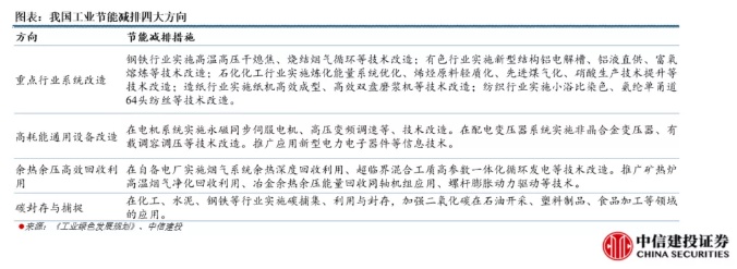 在碳达峰的背景下,我国工业将加快节能减排改造。从具体措施来看,我国工业节能减排主要通过传统工业领域系统改造、高耗能通用设备改造、余热余压高效回收利用、碳封存与捕捉等措施来实现节能减排。