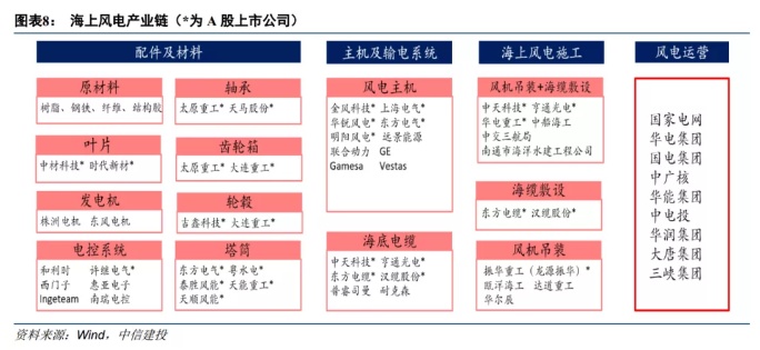风电产业链:风电行业产业链主要包括原材料企业、零部件制造商、风电整机制造商、风电运营商四大环节。