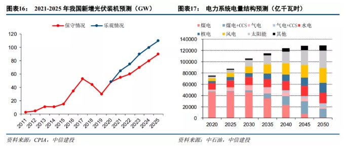 (1)能源结构方面,为实现“碳中和”,光伏、风能等清洁能源在能源中的比重将大幅提升,预计整体比重将从目前的10%以内提升至70%以上,平均每年提升1.5至1.6个百分点的比重。