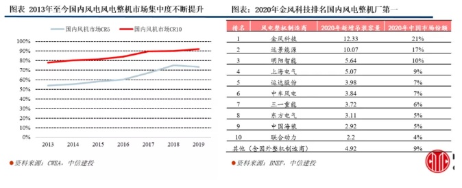 国内风电整机市场(含原材料及零部件)规模超千亿,行业集中度高。从风电场资本开支构成来看,国内风电整机市场(含原材料及零部件)规模超千亿元。风电场资本开支由风电整机、系统平衡(电气基础设施、组装和安装)以及财务费用(保险、建筑融资等)组成,其中陆地风电场资本开支中风电整机投入占比约65-70%,以此推算,国内风电整机市场(含原材料及零部件)规模超千亿元。重点推荐风电整机龙头金风科技(02208)。