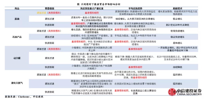 2030年原油在快速脱碳背景下,海运贸易量在达到峰值后会逐渐下滑。动力煤在渐变和快速脱碳背景下也会出现下滑趋势。LNG的确定性较好,无论在哪种情景下,海运贸易量都出现大幅度上涨。