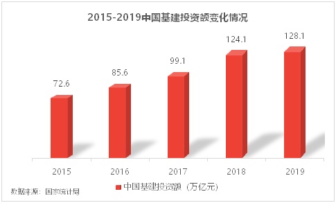 数据显示,2015年至2019年全国基建投资总额保持了持续增长态势,从72.6万亿增长至128.1万亿,复合增长率15.2%。