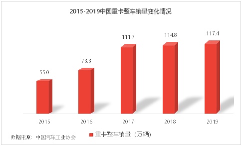 近5年来,重卡行业连续增长,2015年至2019年重卡整车销量复合增长率20.9%。受新国标GB1589-2016的实施、超载超限治理的趋严以及基建复苏等因素的综合影响,中国重卡行业销量连续四年增长,2019年销量达117.4万辆,创历史新高。