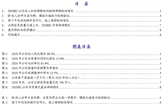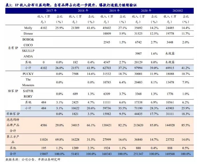 (2)IP热度持续性良好。Molly虽然收入同比有所下降,但我们认为主要与公司战略重心向更多IP倾斜有关。从单系列产品的销售情况看,Molly依然保持着较高的热度。2020年8月推出的Molly一天系列产品,截至2020年底的销售额已突破一亿元。