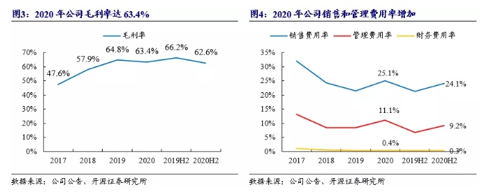 2020年,公司毛利率为63.4%,同比下降1.4pct。其中,2020H2公司毛利率为62.6%,同比下降3.6pct。公司毛利率下降或主要源于公司对产品质量的要求进一步提升,产品工艺进一步升级,环保要求提高等。