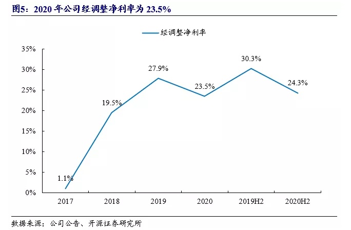 2020年,公司经调整净利率为23.5%,同比下降约4.4pct,主要源于公司毛利率下降和费用率提升。