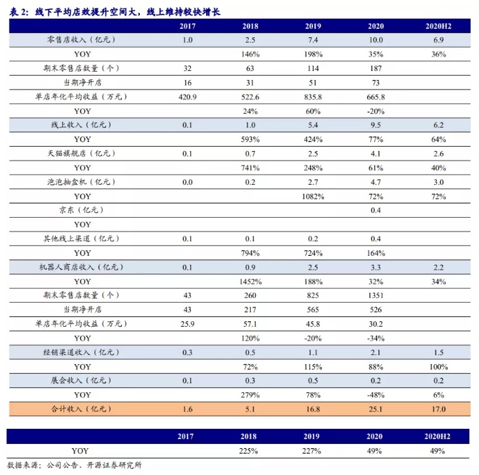 (1)零售店:2020年收入10.0亿元,同比增长35%,其中2020H2收入6.9亿元,同比增长36%,2020年末零售店数量达到187个,当期净开店73个。根据我们的测算,2020年零售店单店平均收益同比下降20%至665.8万元。我们认为平均店效下滑主要与疫情影响和新开店还处于爬坡期有关(2020年开店主要集中于下半年,2020H2净开51家店),因此我们认为公司线下零售店平均店效仍有较大提升空间。并且,我们预计2021年公司新开店数量有望继续保持较快增速。根据勾股大数据,2021年3月18日,泡泡玛特线下零售店已达到212家,相较2020年末公司披露数据增加25家。