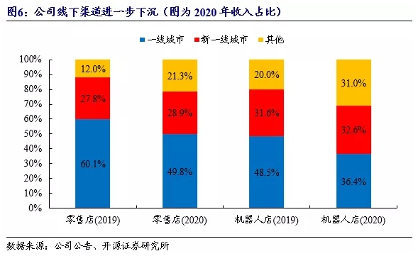 2020年,公司线下渠道进一步下沉。2020年,公司零售店在一线城市/新一线城市/其他城市的收入占比分别为49.8%/28.9%/21.3%,分别同比变化-10.3pct/+1.1pct/+9.3pct,公司机器人店在一线城市/新一线城市/其他城市的收入占比分别为36.4%/32.6%/31.0%,分别同比变化-12.1pct/+1.0pct/+11.0pct。