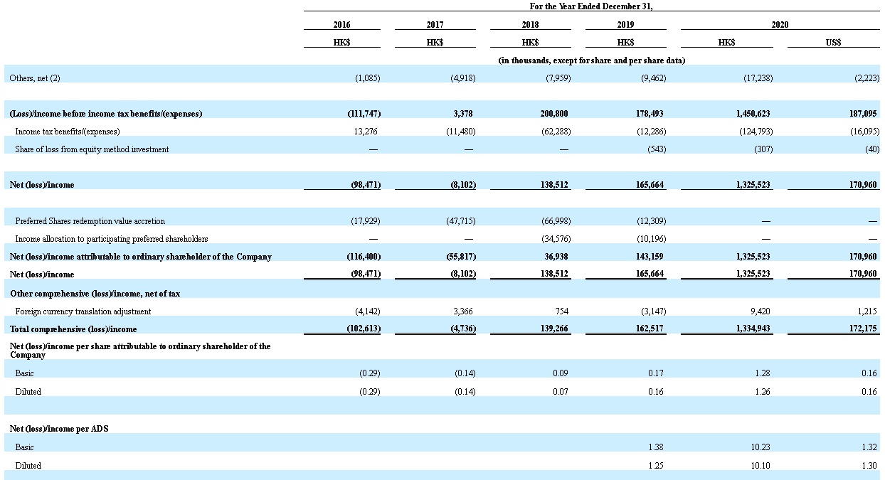 净利润为13.26亿港元,上年同期为1.66亿港元;基本和摊薄后每ADS收益分别为10.23港元和10.10港元,上年同期分别为1.38港元和1.25港元。