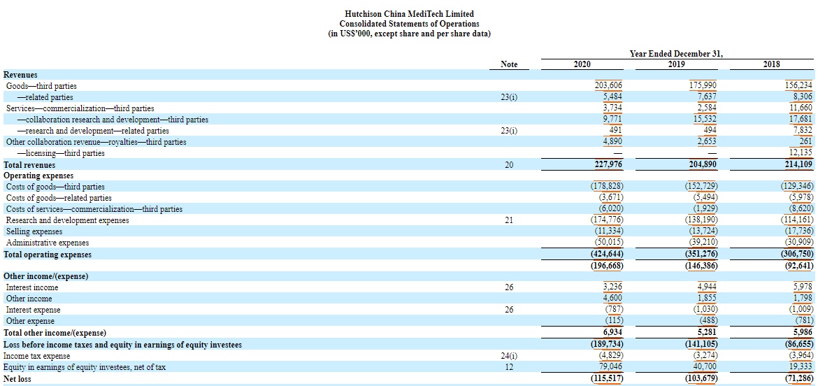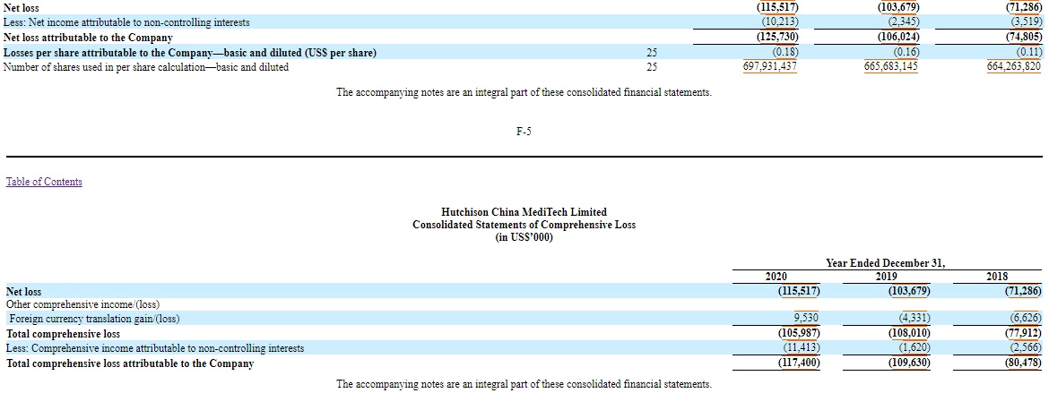 2020年,和黄医药全年公司营收为2.28亿美元,同比增长11.27%;归属于该公司的净亏损为1.26亿美元,同比扩大18.59%;基本和摊薄后每股亏损0.18美元,上年同期亏损为0.16美元。
