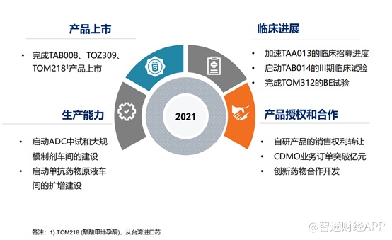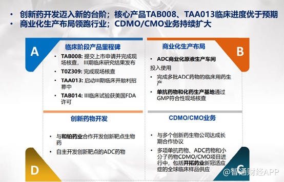 2020年,TAA013进入三期临床,TAB008和TOZ309完成了上市前注册和GMP现场核查,ADC生产车间完成,并完成生产多批临床用药。